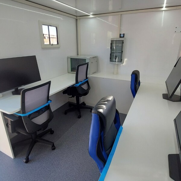 - lunghe scrivanie con cassettiere, 4 postazioni con monitor